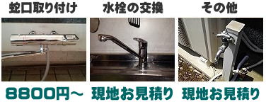 台所蛇口のハンドルが固い/空回りする,キッチン水栓のハンドルが折れた/故障,キッチン蛇口からぽたぽたと水が垂れる,台所水栓付け根から水が染み出る,キッチン水栓のカートリッジ交換,キッチン蛇口交換の見積もりが知りたい,台所蛇口から水漏れしている,台所蛇口の水が止まらない,キッチン蛇口のパッキン交換,台所蛇口の取り付け/取り外し